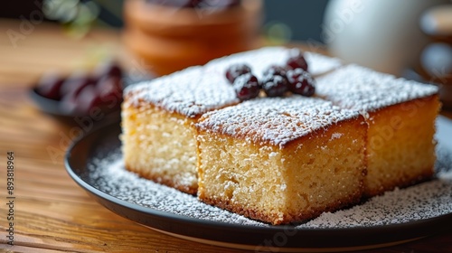 A light and fluffy sponge cake, dusted with powdered sugar, showcasing its delicate texture and subtle sweetness.
