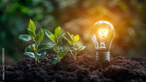 A light bulb emits a warm glow beside young green plants, symbolizing innovation and growth in a nurturing environment.