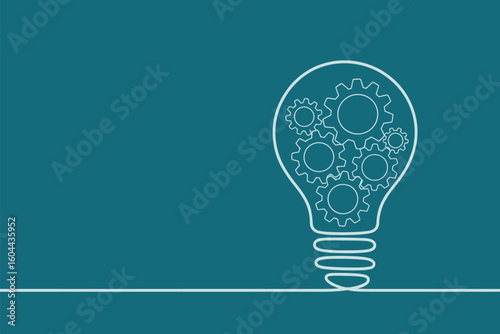 A lightbulb outline filled with gears on a teal background with a horizontal line at the bottom edge