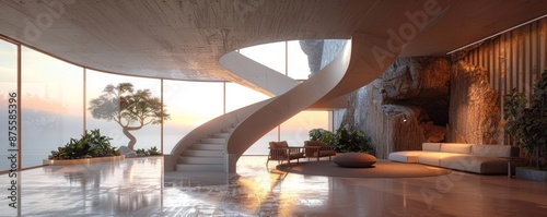 A lighthouse with a spiral staircase leading up to a panoramic window view (realistic)