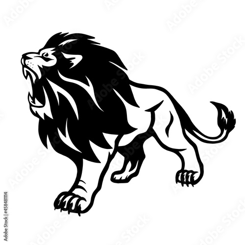 A lion with a bared mouth. The king of the jungle. A relative of the tiger, panther, leopard, cougar, cheetah and domestic cat
