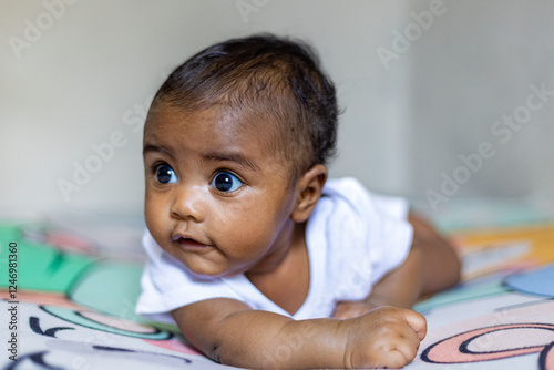 A little girl doing tummy time, a little girl. Newborn premature baby. Tummy time is fun time. African baby, African girl, black baby, Brazilian baby.