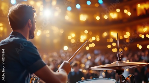 A lively drummer excites the audience during a performance at a grand concert venue. Focused on rhythm, the scene captures the energy of a musical performance.