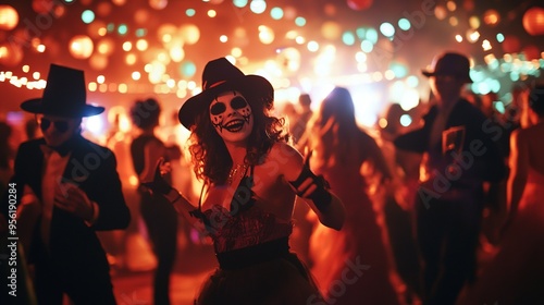 A lively Halloween party with guests in costumes dancing under dim lights.