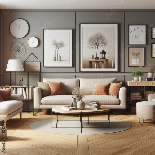 A living room with a template mockup poster empty white and with a couch and a coffee table image photo lively has illustrative meaning.