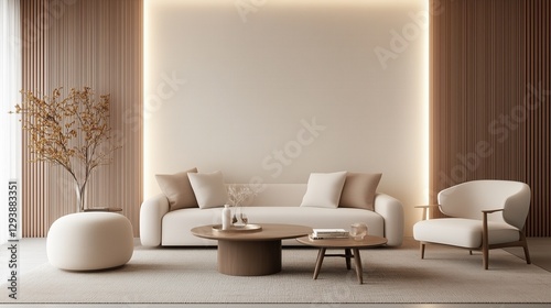 A living room with a white wall and a couch with pillows. A vase with flowers sits on a coffee table