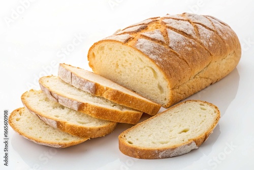 A loaf of bread cut into slices on white background