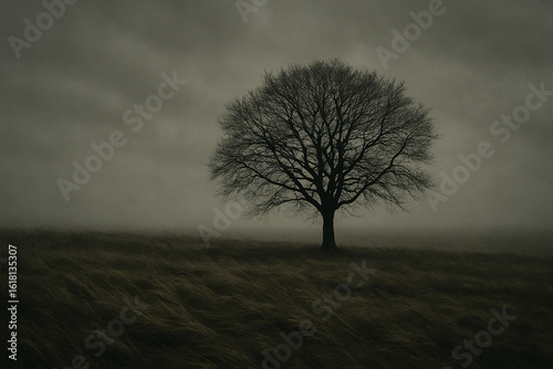 A lone bare tree in the middle of a windy field under a dramatic overcast sky, evoking a sense of solitude and resilience