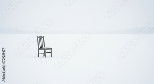 A lone chair sits in a vast, snow-covered landscape under a gray sky.