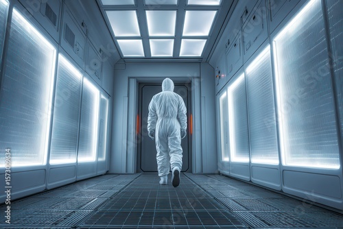 A lone figure in a protective suit walks down a futuristic corridor illuminated by soft lights