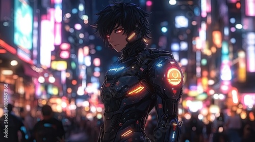 A lone figure in striking cyberpunk armor stands amidst the hustle and bustle of a neon-lit city exuding an air of mystery and strength