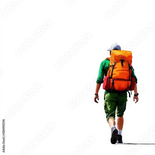 A lone hiker with a bright orange backpack walks away on a path, showcasing a spirit of adventure and exploration in nature.