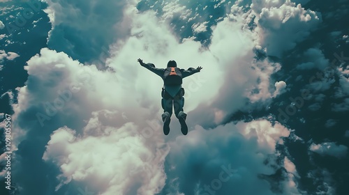 A lone skydiver falls through a breathtaking expanse of fluffy clouds. A moment of pure freedom and excitement.