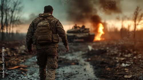 A lone soldier strides purposefully towards a burning tank in the center of a battlefield, surrounded by a stark, war-torn landscape under a moody evening sky.