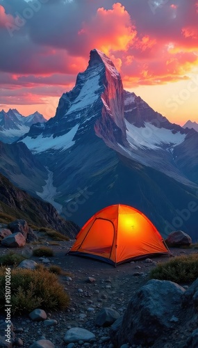 A lone tent pitched amidst a dramatic mountain range at sunset, capturing the spirit of adventurous exploration The rugged terrain and vibrant sky create a breathtaking scene , wilderness, untouched