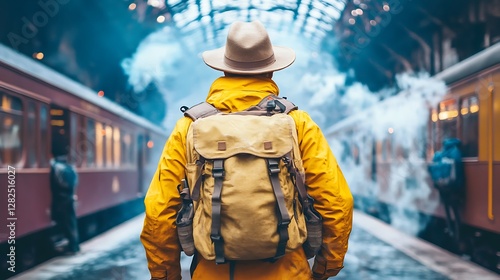 A lone traveler with a backpack stands at a train station, steam billowing from a vintage train, ready for an adventure.