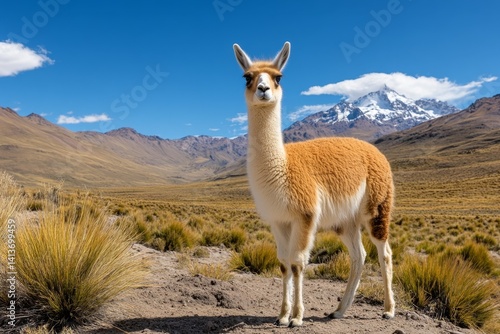A lone vicuña standing in the vast Altiplano region, its golden fur blending with the dry landscape
