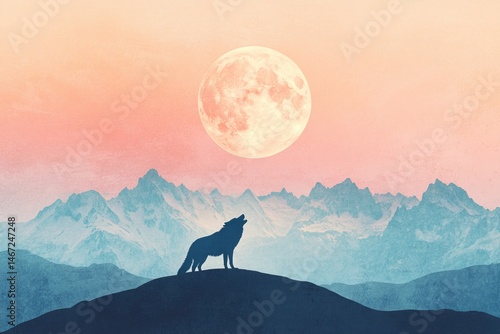 A lone wolf howls at the full moon, standing atop a hill against a backdrop of layered mountains and a pastel sky.