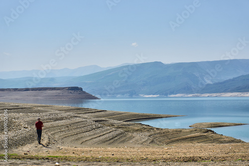 a lonely man walking along blue lake in the mountains