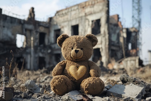 A Lonely Teddy Bear in the Ruins of a War-Torn City