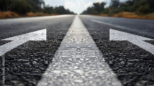 A long, asphalted road with white arrows pointing upwards, symbolizing progress and the journey to success. The clear sky and distant horizon evoke a sense of endless possibilities and determination.