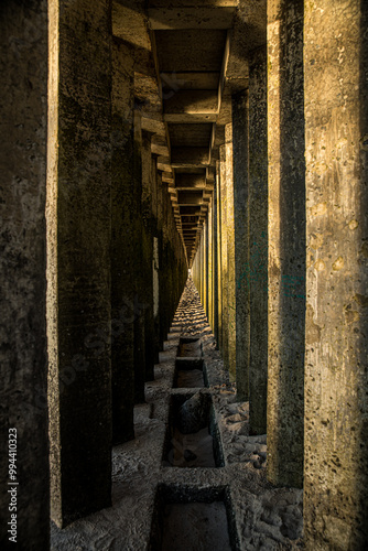 A long hallway has columns and a drain in its center