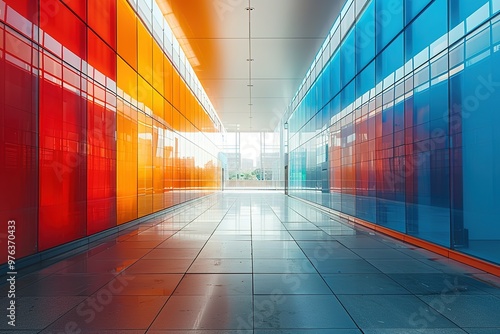 A long hallway with colorful walls and a glass ceiling