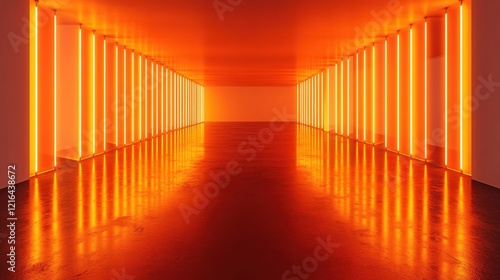 a long hallway with orange lights in it