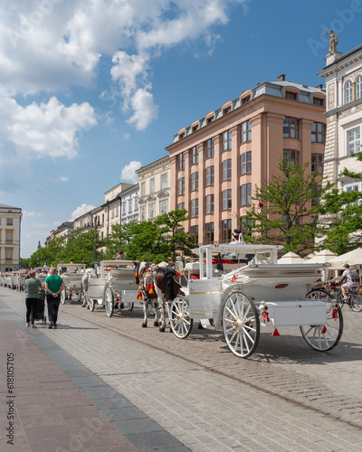 A long line of white horse-drawn carriages waiting for tourists on the gray cobbled street of the old town on a sunny day among the citizens and tourists of Krakow. Horse transport in European cities