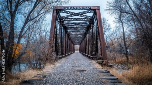 A long railroad bridge extending into the horizon, with steel framework and symmetrical design