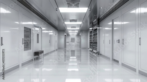 A long, sterile corridor within a commercial food storage freezer, featuring white walls and a gleaming floor, leading to a bright light at the end