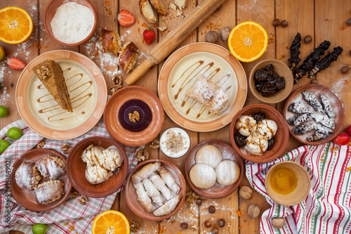 A lot of dessert on the wooden table. Georgian cuisine. Top view. Flat lay . Khinkali and Georgian dishes
