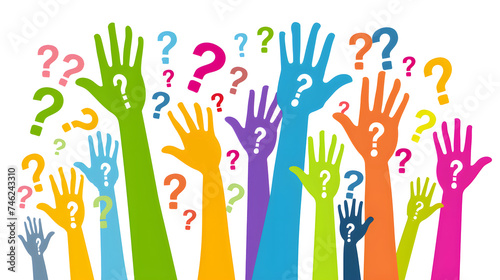 A lot of hands are raised ? up smeared in multicolored, colored paints on a white background. People's hands are raised in the air. Without faces.