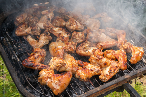 A lot of tasty, delicious, savoury meet (chicken wings) with pleasant odor and meat haze on the grill in the village