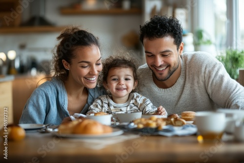 A loving family of mixed-race parents and their adopted child enjoy breakfast together at a cozy kitchen table filled with warmth and morning light.