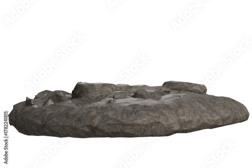 A low-lying, irregular dark gray rock formation with a textured surface, casting subtle shadows, isolated background. Looks like a natural stone platform