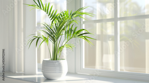 A lush green houseplant basking in the soft sunlight by a window.