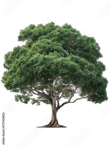 A lush, green tree with a broad canopy and intricate branches, showcasing vibrant foliage.