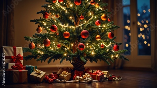 A lush, magnificent Christmas tree richly adorned with ornaments stands beautifully indoors.