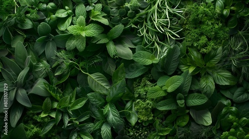 A lush variety of fresh, green culinary herbs and leaves tightly packed together.