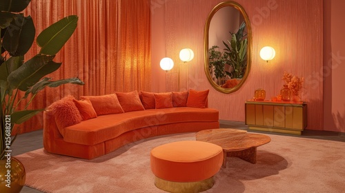 A luxurious lounge with Peach Fuzz-painted walls and oversized gold mirrors.