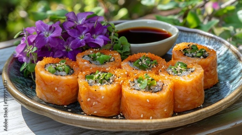 A luxurious plate of uni sushi rolls with creamy sea urchin filling, topped with delicate microgreens and served with a side of soy sauce.
