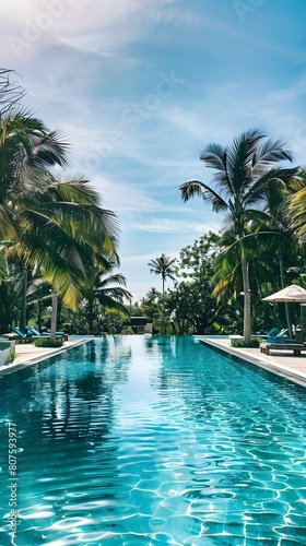 A luxurious pool glistens in the sun, surrounded by lush palm trees. The tranquil blue water invites relaxation and escape from the outside world
