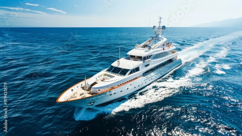 A luxurious yacht cruising through the blue sea with a party happening on deck