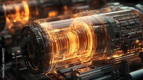 A machine with a glowing yellow tube. The tube is made of clear plastic and is surrounded by other parts of the machine. Scene is futuristic and technological