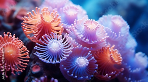 A macro view of Christmas tree worms Spirobranchus emerging from coral, spiral radioles in gradient hues,