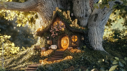 A magical fairy house inside a white oak tree, decorated with gold bars and bitcoins as symbols of thriving prosperity.