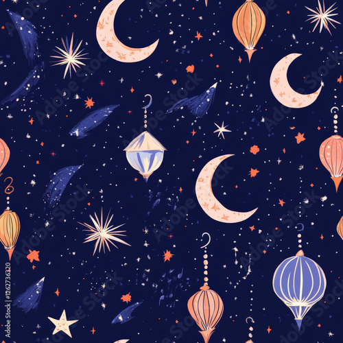 A magical night sky pattern featuring crescent moons, floating lanterns, and shooting stars