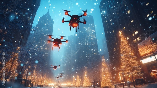 A magical snowy night with drones flying between skyscrapers, each carrying glowing holiday presents, snowflakes sparkling in the air, urban buildings adorned with colorful Christmas lights,