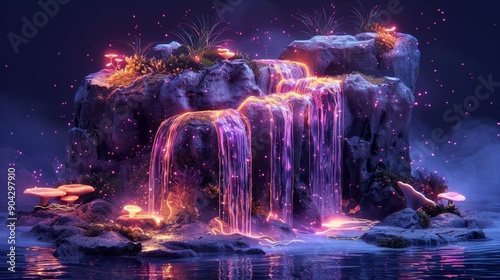 A magical waterfall flows with vibrant purple light, surrounded by glowing mushrooms and ethereal butterflies in a fantastical landscape.